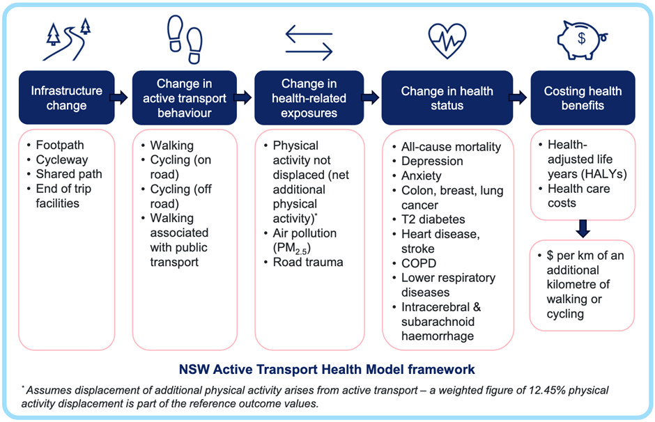 Our point is, these investments must start soon and should not be considered optional, even in a tight budgetary situation. By applying a preventive health lens to the analysis, particularly if there were an actuarial microsimulation model that can predict how much the population health benefit result may be, would improve the chance of these projects being funded (Figure overleaf, sourced from the NSW Active Transport Health Model, outlines a framework for this).