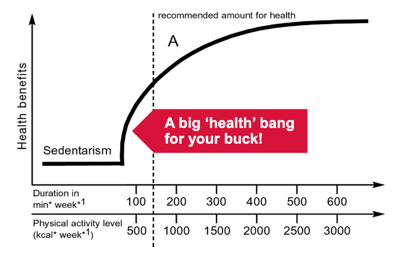 We believe physical activity should be a focus for the Strategy as it helps to reduce the risk of major illnesses such as diabetes, cancer and heart disease, and improves quality of life. The following graph illustrates the significant health gains with increased ‘dose’.