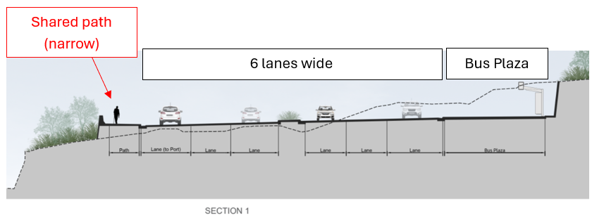 The concept released to the public shows little information on infrastructure for pedestrians and micromobility - it shows a shared path along one side of the road, which appears too narrow for comfortable and safe use for pedestrians and cyclists.